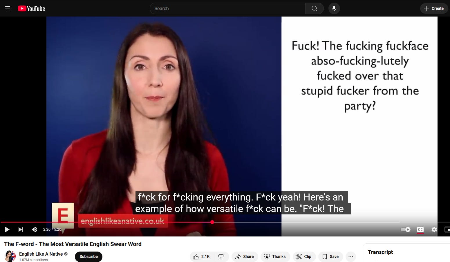 This is Anna English. “I am British, therefore I teach British English,” she says in her video wherein she teaches non-native speakers the correct and myriad uses of “fuck,” which she calls a “unique, offensive but oddly beautiful, four-letter word.”